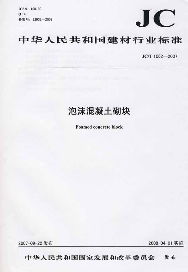 施工單位應(yīng)當(dāng)對(duì)進(jìn)入施工現(xiàn)場(chǎng)的墻體材料、保溫材料、門窗、采暖制冷系統(tǒng)和照明設(shè)備進(jìn)行檢驗(yàn),不符合施工圖設(shè)計(jì)文件要求的,不得使用! 中華人民共和國(guó)建材行業(yè)標(biāo)準(zhǔn) JC/T1062-2007 泡沫混凝土砌塊 2008-04-01實(shí)施 國(guó)家標(biāo)準(zhǔn) |